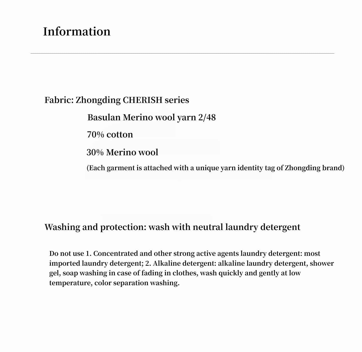 High proportion of ultra-fine merino wool, delicate and gentle to the touch, soft and glutinous in color, the wool has been mercerized, with a glossy and tactile feel, shrink-proof, anti-pilling, easy to care for and not prone to wrinkles.
