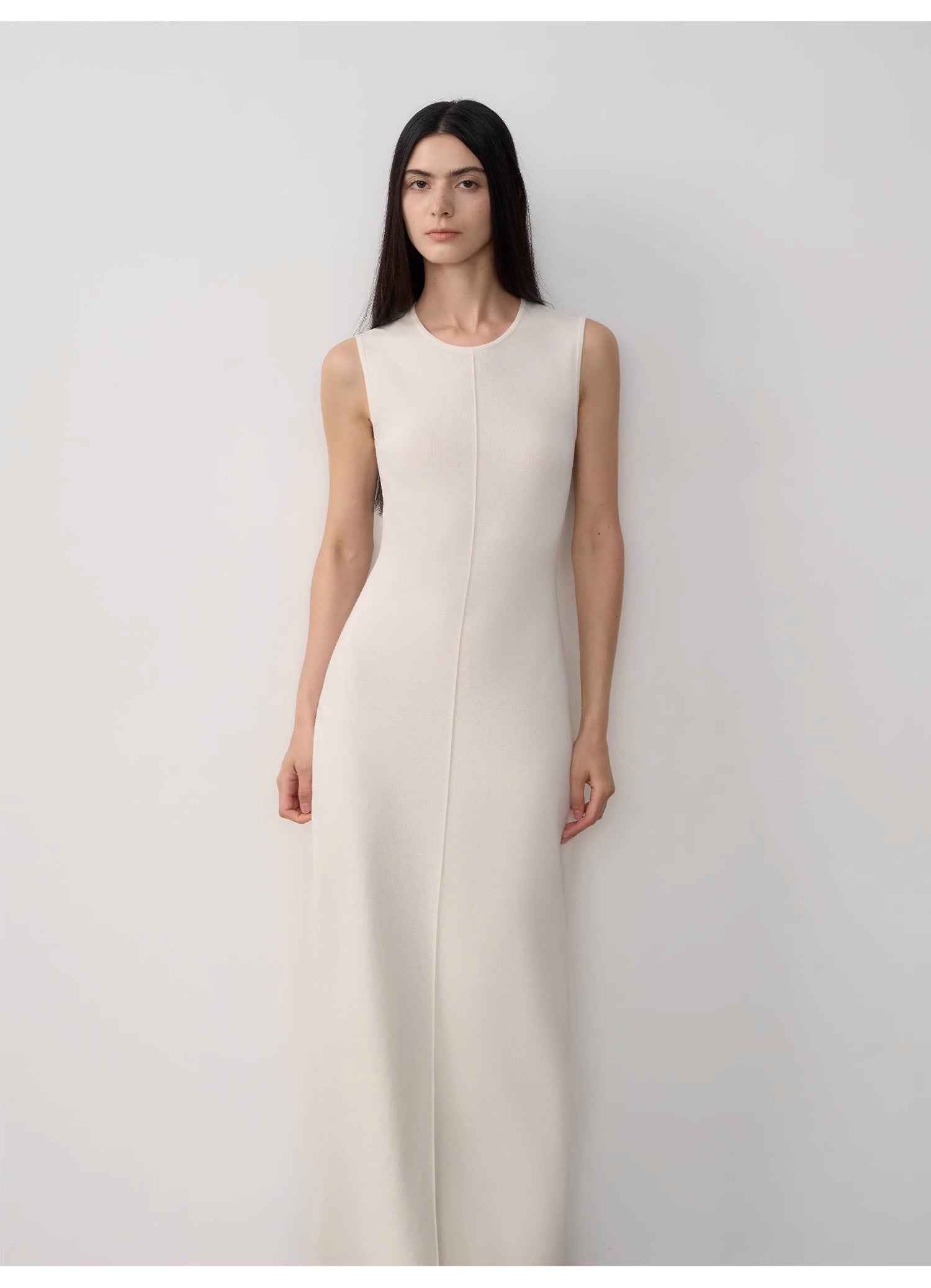 Designed with a classic round neckline and a subtle center front seam, this piece elongates the figure while maintaining a fluid, graceful drape. The ankle-grazing length enhances its understated elegance, making it perfect for everything from quiet mornings to elevated evenings.